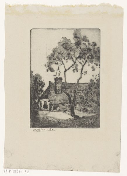 Editor: So, this is "Poort naast een huis," or "Gate Next to a House," an etching and print made in 1884 by Maria van Hohenzollern-Sigmaringen. It depicts a stone archway, a woman walking through it, and a house attached. It's very detailed. How do you interpret this work? Curator: I see this piece as more than just a simple landscape. It speaks to the intersection of public and private spaces, a very timely topic, actually. How might the architectural structures, the gate and the house, define and control movement and access within society? Consider, who is granted entry, and who is excluded? What’s behind that gate? Editor: That’s interesting. I hadn’t thought of it in terms of access. Curator: And think about the artist, Maria van Hohenzollern-Sigmaringen. She was a Countess. How does her privileged position inform her perspective on this everyday scene? Does it romanticize the working class passing through the gate or does it make us more aware of how access might have been denied at the time based on your standing in society? Editor: That brings another dimension to it, for sure. It’s like, who has the right to depict this scene and what is their motivation? Curator: Exactly! The etching captures a fleeting moment, but it also hints at broader social dynamics. Does this woman represent the working class on the margins and can we analyze the power structures embedded within the landscape itself? Does art by privileged women depict that social stratification or undermine it? Editor: I see that her choices as the artist are critical to interpreting the work’s statement. It's amazing how much context changes my initial understanding. Curator: Precisely. And it invites us to consider whose stories are being told, and from what perspective.
