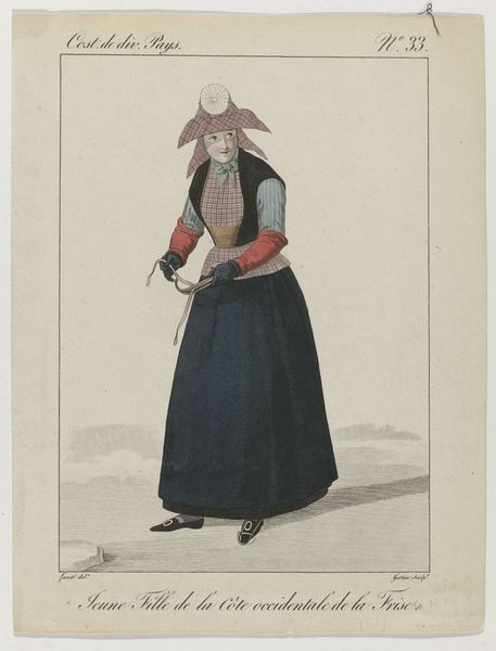 Editor: This is "Klederdrachten van eiland Gozo," or "Traditional Costumes from the Island of Gozo," a watercolor by Louis Ducros from 1778, held at the Rijksmuseum. I find the subject’s stance, with his arms crossed, rather defiant. How do you interpret this work? Curator: I see this as more than just a simple record of clothing. Think about 1778: Europe’s fascination with the “exotic” was flourishing. This image, then, becomes implicated in colonial ways of seeing. Who is Ducros depicting, and for what audience? Is he genuinely interested in cultural exchange, or is he participating in the objectification of Gozitan people? Editor: That's a great point. I hadn't considered the perspective of the artist. So, the way he presents the figure could reinforce existing power dynamics? Curator: Exactly. The individual is presented as a type, an example, rather than an individual. His expression is neutral, almost stoic. The crossed arms could read as defiance, as you mentioned, but also as a kind of passive resistance, a withdrawal from the viewer’s gaze. What’s fascinating is that these depictions were used to categorize and control populations within the growing colonial framework. Do you see how even seemingly objective documentation can serve a particular ideological purpose? Editor: Yes, that’s so interesting! I'm beginning to think about how even seemingly innocuous genre paintings can have deeper social and political implications. I now see the piece as part of a larger historical narrative. Curator: And understanding those narratives is key. Art becomes a powerful tool when we use it to question not only what we see, but also why and how we see it.
