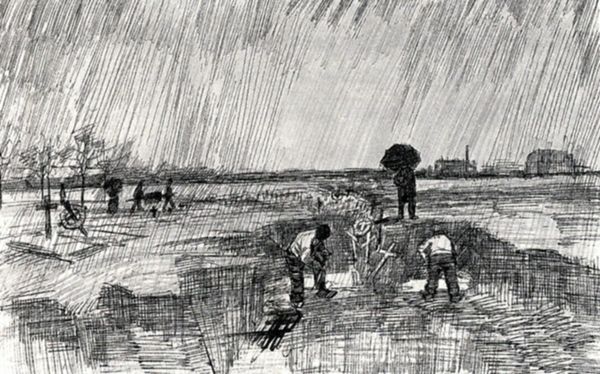Editor: This is Van Gogh’s 1883 pencil drawing, "Woman with a Fork in a Winter Landscape." It has a somber, bleak quality, and makes me wonder about the subject’s experience of work and poverty. What strikes you about this piece? Curator: I see a potent commentary on labor and materiality. Van Gogh here presents us with a raw, almost brutal depiction of agricultural work. Consider the ‘fork’ – not as a tool of cultivation here, but a simple instrument reflecting the arduous labor, almost a gesture of resistance and survival under harsh winter conditions. What kind of fork do you think it is? Editor: It seems more like a garden fork for turning over soil. Why do you ask? Curator: It signifies a direct connection between the woman, the earth, and her labor. Van Gogh isn’t idealizing rural life; he is showing us the hard reality. The ‘pencil drawing’ medium itself speaks to this. It's economical, immediate. It allows for direct, unadorned representation, like the woman's labor. Where does labor typically exist? Editor: I suppose more outside of "fine art" contexts and more in working class settings like farms. So you’re saying Van Gogh is bringing an awareness to labor as an important aspect to capture, using humble materials and straightforward techniques. Curator: Exactly! This work, therefore, isn't just a depiction of a landscape, but it's a document, a record of the social conditions of rural workers at that time. And how the production, medium and technique speak to it. Editor: It makes you think about how art can reflect the lives and struggles of ordinary people through a more materialist perspective. I never really thought about it that way. Curator: Precisely! Recognizing art's connection to the material conditions of its creation is essential for understanding its broader meaning.