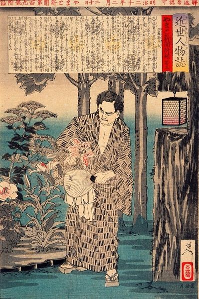 Editor: This is Kobayashi Kiyochika's woodblock print, "SÅgo at the Ferry Landing," dating from around the late 19th century. I'm really drawn to the texture of the snow and the way it seems to weigh down everything. What can you tell me about it? Curator: Kiyochika's prints, particularly those depicting Meiji-era Tokyo, are fascinating. Consider the materials: woodblocks, ink, paper. The artist's labor, the printer's skill – these are all crucial. How does the printmaking process itself shape our understanding of this winter scene and the figure's place within it? Editor: That's a great point! It makes you think about how widely this scene could be reproduced. Curator: Exactly! And how that accessibility shapes the consumption and understanding of the imagery.