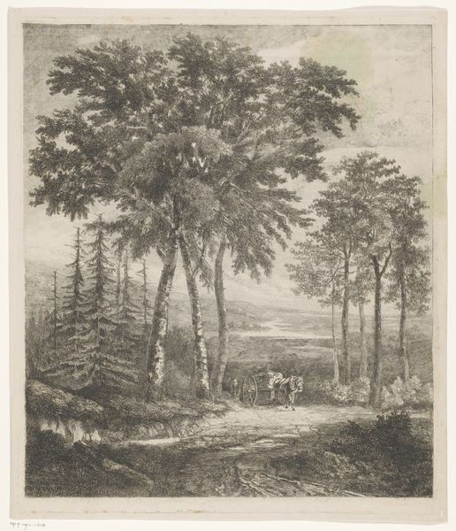 Editor: We are looking at Elias Meyer’s “Steensætningen i Frederiksberg Have,” dating from around 1763-1809. It’s an etching and engraving, depicting what appears to be a dolmen in a park. It strikes me as… wistful. The people seem small against the backdrop of this ancient monument and the trees. What captures your attention in this work? Curator: Wistful is a lovely word for it. For me, it’s the interplay between the grand, almost theatrical trees and the rather humble human figures. You've got this very deliberate romanticization of nature juxtaposed with people simply enjoying a day in the park. Makes you wonder what stories they’re spinning about the old stones. Don’t you think? Editor: I do! They almost look like actors on a stage. It makes me think about the stories we tell ourselves about the past. Curator: Precisely. It's like Meyer's saying, "Look! We’re all part of this ongoing narrative.” Even the dolmen becomes a character. I imagine visitors feeling a certain weight or connection, and he wanted to capture that. Almost like pressing a flower between the pages of history. What do you take away from it? Editor: It’s made me realize how much landscapes can be about history and memory, not just pretty scenery. Curator: Right? Suddenly those etched lines feel less like simple marks, and more like whispers of time, experiences lived, tales told… Editor: So much more depth in what looks like a simple print! Curator: Indeed! Art often rewards the patient gaze and the open mind. There's more in these delicate little works than first meets the eye.