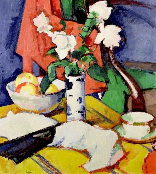 Samuel Peploe's "Still Life with Roses" is a visual symphony composed of roses, fruit, and porcelain. Here, the rose emerges as a poignant symbol, an emblem of love, beauty, and transience, reminiscent of Renaissance paintings where a wilting rose signaled life's fleeting nature. This flower echoes through centuries, from ancient Greek myths to Victorian poetry, each era imbuing it with layers of meaning. Notice the interplay of color and form, the way Peploe captures the ephemeral beauty of the roses. This echoes the vanitas tradition, a mirror reflecting our mortality. The roses, in their fragile beauty, remind us of the cyclical nature of life, death, and rebirth, a theme that has captivated artists and philosophers alike. The emotional resonance of the rose persists, stirring collective memories and subconscious connections. Peploe’s painting taps into this deep well of symbolism, engaging viewers on a profound, often unspoken level.