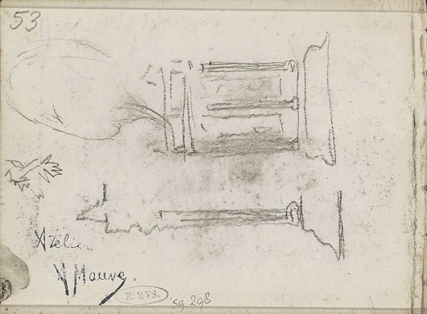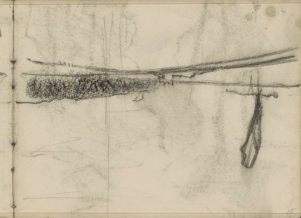 This drawing, "Sleperswagen" by Isaac Israels, now at the Rijksmuseum, presents a stark composition dominated by linear forms. The charcoal or graphite lines sketch out the rudimentary shapes of a wagon. The work hovers between representation and abstraction. Israels, known for his involvement with the Amsterdam Impressionism movement, here plays with the barest essentials of form. The wheels are rendered as simple circles, the wagon's bed as a horizontal line, challenging our perception of volume and space. We might consider how this sparseness destabilizes the conventional artistic values of detail and finish. The medium, with its grainy texture and tonal gradations, introduces a sense of ephemerality. The sketch acts as a sign, pointing to industrial progress and the evolving urban landscape. It invites us to reflect on how artists use the fundamental elements of art—line, shape, and tone—to create meaning, question established norms, and engage with contemporary cultural shifts.