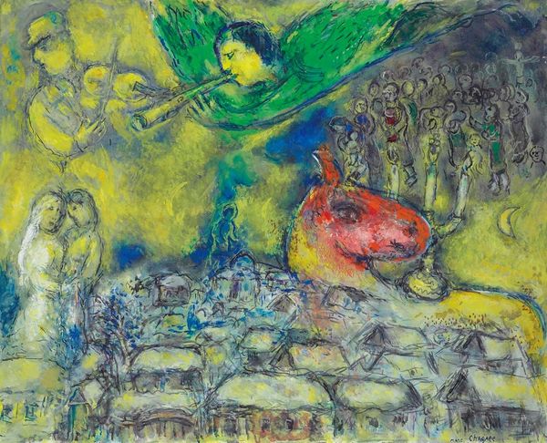Editor: We’re looking at Marc Chagall’s “Vision du peintre au double visage,” created between 1978 and 1980, a gouache and oil on canvas. I'm struck by how dreamlike it feels, a jumble of figures and a cityscape rendered in vivid blue, red and green. What do you see in this piece? Curator: It's more than a dreamscape; it's a layered exploration of identity and belonging, typical of Chagall, given his complex negotiation of Russian Jewish identity in a rapidly changing world marked by conflict and displacement. How does the dual face of the artist strike you in the context of these themes? Editor: It’s like he's presenting two versions of himself, maybe his inner and outer selves. The figures around him – the musician, the floating lovers – seem pulled from memory and folklore. Curator: Exactly. They evoke a collective memory, speaking to diasporic experiences where folklore and tradition are constantly reshaped. Consider the composition: it disrupts the conventional figure-ground relationship. Is Chagall maybe pushing us to question established hierarchies and perspectives, just like feminist theory challenges the patriarchy? Editor: The way he blends the cityscape with these figures definitely challenges a traditional, stable perspective. So, the figures aren’t just personal symbols, but also part of a larger social narrative? Curator: Precisely. Chagall wasn’t just painting pretty pictures, but offering a commentary on displacement and identity through the lens of his lived experience as a Jewish artist navigating early 20th century Europe. What would you say is the painting's legacy for contemporary artists dealing with similar themes of cultural hybridity? Editor: I guess it proves how personal symbolism can speak to a collective experience. That mixing of styles and subjects isn’t just whimsical—it’s a way to explore identity itself. Curator: Absolutely, his work laid groundwork for artists who strive to weave personal narrative with cultural criticism. It certainly highlights the power of art to both document and transform our understanding of the world.