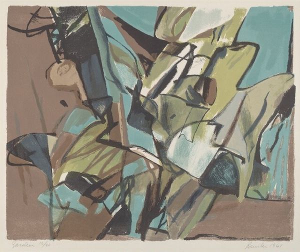 "Spruce Clearing #2" is a color woodcut made by George Bunker in 1957. The mid-20th century was a period of significant social change, marked by both optimism and anxiety, particularly after WWII. Bunker, a white male artist working at this time, presents a scene deeply connected to nature, a theme often explored as a means of solace. The print uses an array of warm colors and abstract shapes to depict a clearing in a spruce forest. The composition, with its fragmented forms, evokes a sense of both harmony and disruption. There is an emotional tension between the chaotic arrangement of shapes and the serene, grounding presence of the trees. Bunker’s abstraction may mirror the shifting perspectives and anxieties of his time. It invites us to reflect on our relationship with the natural world. How we seek refuge and find beauty amidst change. In essence, the artwork becomes a space where the personal and the political intersect through the lens of nature.