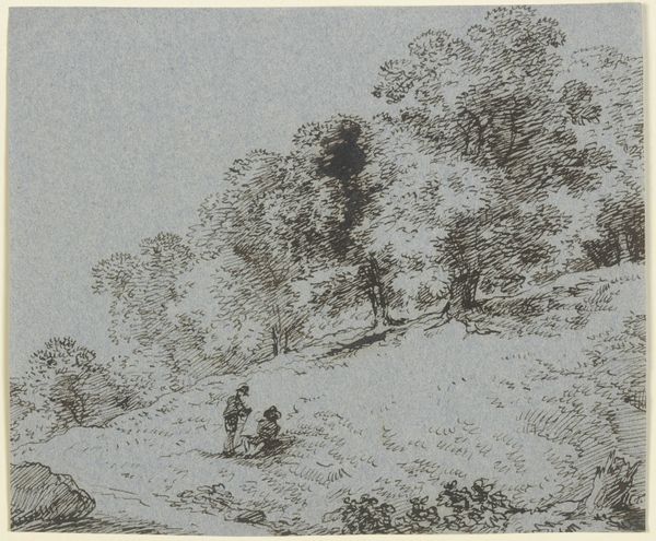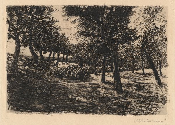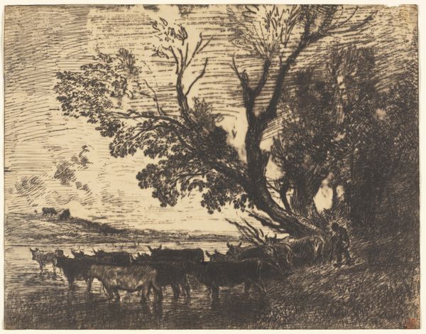 This print, "Two Travelers in a Forest," was made by Camille Corot, sometime in the mid-19th century. Corot lived through considerable political upheaval in France. Revolutions and shifting social structures were a constant backdrop to his life. Here, a horse and rider pause alongside a figure on foot, deep within a densely wooded area. The forest, in its romantic appeal, could almost be said to be the main subject. The figures seem secondary, rendered with less detail. The print captures a moment of respite. But, consider the social implications of travel in this era; the stark realities of class and access. The rider on horseback, a symbol of privilege, is contrasted with the pedestrian, suggesting a social hierarchy inherent even in leisure. Despite its tranquil surface, this work subtly reflects the complex social dynamics of 19th-century France, inviting us to consider the unseen stories and inequalities that shape our perception of even the simplest pastoral scene.