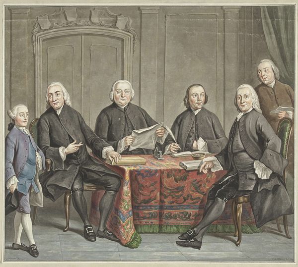 This is a mezzotint print by John Faber II, made in the 18th century, and depicting a gathering of men around a table. Mezzotint is a printmaking process that relies on careful labor. The metal plate is roughened, then polished to create the tonal range. Dark areas are left rough, while lighter areas are smoothed. The process allows for rich textures and subtle gradations of tone, as you can see in the rendering of the men's clothing. The clothing itself speaks to social status. Note the fine fabrics, elaborate wigs, and tailored cuts, all indicators of wealth and privilege. The scene suggests a convivial gathering, perhaps a social club or meeting of merchants. The amount of work involved in the production of the print, from the preparation of the plate to the final impression, underscores the value placed on skilled craftsmanship at this time. This print represents a fascinating intersection of artistic skill, social status, and material culture in 18th-century society, and challenges us to consider the labor involved in both its creation and the lifestyles of its subjects.