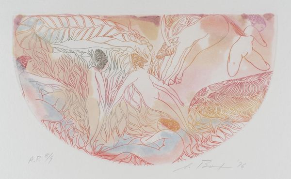 Editor: So, this is Stanley Boxer's "Oddconversationatnoon," a print from the Tate. I'm struck by how dreamlike it feels, with these figures and abstract shapes kind of floating together. How do you interpret this work in the context of its time? Curator: It's interesting you say 'dreamlike.' Boxer, active in a period marked by shifting art world dynamics, often resisted easy categorization. Considering the social and political climate, do you see a deliberate escape into fantasy here, perhaps a commentary on the public's role in engaging with art versus retreating from reality? Editor: That's a good point. I hadn't considered it as a form of escapism, but the ambiguity and lack of clear narrative could point to that. Curator: Precisely. And how might the choice of printmaking, a medium often associated with accessibility, play into his broader artistic intentions? Editor: I suppose making it accessible challenges the elite art world. I’ll have to keep that in mind. Curator: Indeed. It encourages us to question who gets to define art and its purpose in society.