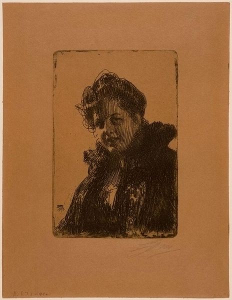 Anders Zorn made this etching of Mme. Granberg in 1905. It’s all about lines really; hatched lines, cross-hatched lines, lines that build up to create darks and lights. The thing about lines is they create an image, but they also have this energy. Look at the way the lines around her face kind of vibrate, like she’s not just sitting there, but thinking, breathing. Zorn's marks are confident, economical. It's amazing how much information he conveys with so few strokes. The texture is implied, not labored over. The darkest area, her coat, is a dense, velvety mass of tiny, angled lines. Then notice how the lines around her left eye are so subtle, suggesting a gentle curve of the cheek. You see this kind of mark-making in other etchings, like those by Whistler. But Zorn has this casual, almost swaggering quality, a real confidence. It makes you think about how art’s a conversation, with artists riffing off each other, finding their own voice.