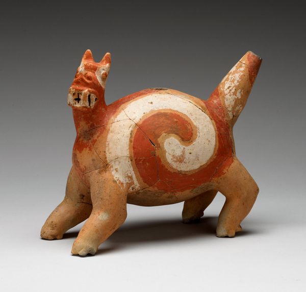 Editor: This charming ceramic sculpture, "Vessel in the Form of an Animal with Four Legs and Long Tail" from around the year 400, looks almost playful. The material itself gives it such an earthy feel. The speckled surface adds an intriguing textural contrast. What catches your eye when you look at this piece? Curator: What arrests my attention is the successful synthesis of function and form. Consider how the cylindrical opening disrupts the animal's dorsal plane. Its utility as a vessel does not detract from, but rather integrates with, the figuration. Observe, too, how the artist renders a believable quadruped, but with minimal surface modulation and a high degree of simplification, arriving at something potent. Editor: I hadn't thought about the cylinder's disruption being part of the art, I just saw it as practical. Do the spots have some formal function? Curator: Precisely. Note how the distribution of spots counters any potential monotony in the underlying terracotta hue. Their non-uniform placement introduces an element of visual complexity that sustains interest. How might you contrast this form with more modern vessels? Editor: I think the rough quality would look odd now; we're so used to refinement in design. I guess that shows how much craft has changed over time, as a concept. Curator: A vital insight. What the vessel may lack in surface perfection, it more than compensates for in textural directness and sculptural power. One appreciates this raw honesty. Editor: This conversation really has sharpened how I look at shape and texture. Now I can really see how sophisticated this seemingly simple piece of pottery is. Curator: Indeed, careful analysis of formal properties enables us to decode the complex aesthetic of an artwork that at first glance may seem rudimentary.