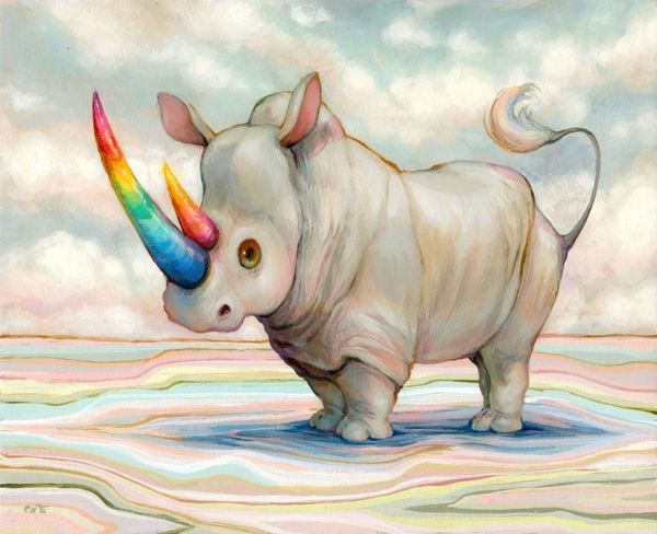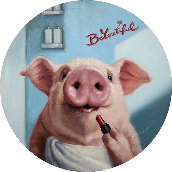 Curator: Well, this is…unexpected. I’m immediately struck by the surreal nature of this piece. Editor: Yes, "Tooth Fairy" by Lucia Heffernan, part of her series exploring animals in human roles. It's an acrylic painting that certainly grabs your attention. The artist uses caricature to create this playful image. Curator: It does! There’s so much visual information—the pig in a pink tutu, the tiny wings, the gold crown, even the number 283 printed on the bodice. And a tooth, clutched so delicately! All these familiar, whimsical icons mashed together. It awakens so much collective childhood memory. What do you make of it? Editor: I see this work engaging in the ongoing conversation about representation. The hyper-femininity of the fairy combined with the pig form becomes commentary about societal expectations placed upon both women and, more broadly, figures perceived as ‘other.’ Curator: Fascinating. I also wonder if there’s an element of the trickster archetype here, bending those very expectations. The pig has a certain knowing gaze, doesn't it? It seems like it’s aware of the expectations—perhaps even complicit? Or perhaps a quiet revolt? Editor: It makes one question how we are programmed to understand and accept these characters. Think of how dominant fairytale iconography still is! In what ways does humor here allow a critical reading? What statements are being made about cultural conditioning? Curator: Right, the symbolism here feels very pointed. But at its core, it also works as a kind of playful modern bestiary entry—pig, fairy, tooth—all linked. The symbols may not always stand for what we expect. Heffernan uses what is recognizably culturally legible—then tweaks our expectations of what a fairy figure represents. Editor: And it highlights our role as viewers. How willing are we to have those archetypes unsettled, and what does our discomfort, or enjoyment, reflect back on us? Curator: Very thought-provoking. A sweet yet subtly unsettling fairytale disruption that lingers with you, it does. Editor: I agree. The blending of childlike whimsy with subversive themes gives a new language to old stories. It reframes how we think about those very systems.