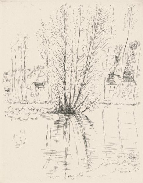 Curator: Welcome. Let’s consider "Fiesole," a 1963 etching and ink drawing by Jerome Kaplan. It captures a landscape scene. What is your immediate take? Editor: There's an almost dreamlike quality to the print. The starkness, the monochromatic ink, the somewhat scratchy texture – it conjures a feeling of solitude, perhaps even a bit of melancholy. Curator: It is compelling how the repetitive, directional lines in the foreground lead the eye deeper into the landscape, structuring space and providing linear perspective through relatively simple, even minimalist, means. Consider the effect of those lines; it’s not merely representational, but performative in its act of drawing our gaze. Editor: And that’s where the iconography starts to build for me. That winding path… is it a pilgrimage, a life journey? Paths often symbolize choices, directions in life, don't they? This landscape, presented so starkly, asks: what does this journey cost us, demand of us? Curator: That’s a generous reading. However, I'm struck more by Kaplan’s economical deployment of line to convey texture, shadow, and form simultaneously. Look at how a slight change in density and direction can evoke the solidity of a stone wall, or the volume of a tree. Editor: Yes, technically it’s fascinating, but consider the symbolic resonance of trees. They stand for growth, connection to the earth, the cyclical nature of life, all intensified by the barren composition. Even the city of Fiesole itself is ancient— a cultural memory layered onto the visual one we’re experiencing here. Curator: It’s hard to ignore that interplay between flatness and depth; the eye oscillates between surface and simulated three-dimensionality. The visual push and pull elevates the whole experience from simple observation to active interpretation. Editor: An active, deeply personal interpretation, as this sparse rendering of a known landscape opens a door to shared feelings. This image taps into universal narratives of memory, loss, and the inexorable passage of time. I leave here with a palpable sense of quiet reflection. Curator: Precisely, thank you, by calling into action basic elements such as tone, shade, form and texture, and imbuing an understated landscape with the power to elicit the quiet contemplation that lies beneath.