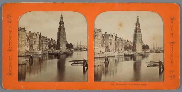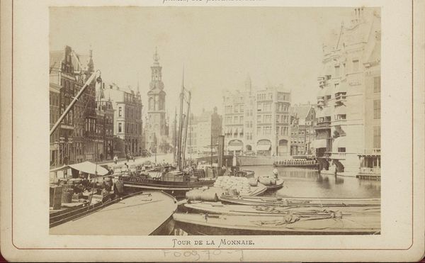 Editor: This albumen print, taken after 1877, captures a "View of Barges on the Amstel with the Mint Tower in the Background." I’m immediately struck by the stillness; the water's so calm it mirrors the city. What stands out to you about this particular image? Curator: It’s fascinating how photographs like these become vessels of collective memory. The Munttoren, anchoring the scene, acts as a powerful symbol, not just of Amsterdam but of its history as a center of trade and power. Editor: So, the Munttoren serves almost like a historical anchor in the photograph? Curator: Precisely. It roots us, connecting the viewer to generations who saw that same tower amidst different, yet similar, bustling activities. Look at the placement of the boats; the photographer has framed them so they almost lead towards the tower. They draw our eyes back to that enduring structure. How do you feel that informs the reading of the work? Editor: It makes the past feel so present! The water reflecting the tower makes it feel doubled, as though we are seeing the present, and also, the city's legacy at the same time. I hadn't considered the emotional weight of the tower before. Curator: Photography freezes moments, yes, but it also unfreezes emotions, perceptions connected with that time and place. It’s interesting to consider what people *then* might have felt about this very scene compared to our view today. It is the same image but contains completely different sets of meaning. Editor: That's amazing to think about. I am now left considering what aspects of my everyday environment will later resonate for future viewers. Curator: Exactly. We are all part of a much larger symbolic tapestry.