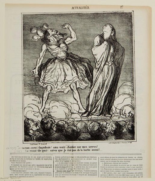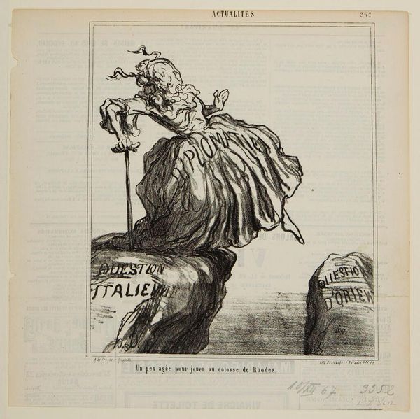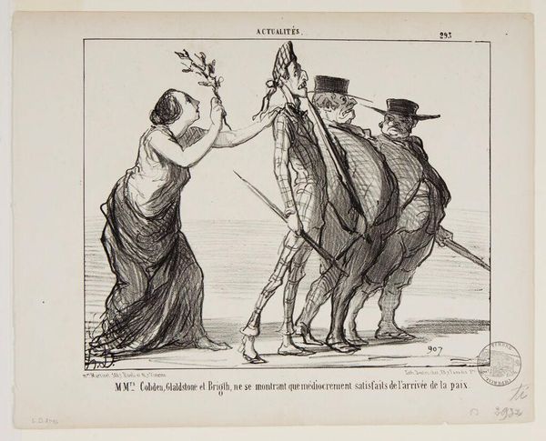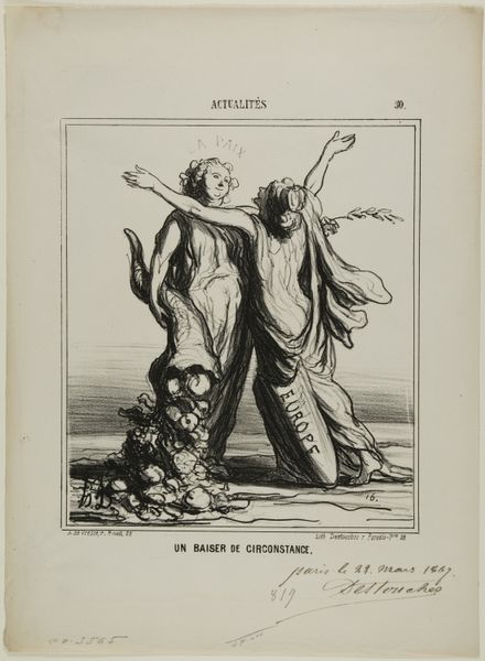 Editor: Here we have Honoré Daumier's "A Happenstance Kiss," a black and white print held at the Harvard Art Museums. The figures seem to represent peace and Europe, but there's a sense of unease. What's your read on this? Curator: Daumier was a master of political satire. Notice how "Europe" leans on "Peace," almost stifling her. What does that suggest about power dynamics and the supposed embrace of peace after conflict? Editor: I see what you mean. It's not a mutually beneficial embrace. Curator: Exactly! And consider the pile of what appear to be cannonballs at their feet. What does this imagery evoke in the context of 19th-century France? Editor: That even in peace, the threat of violence is ever-present. It's a powerful critique. Curator: Indeed. Daumier compels us to question whose peace is being celebrated and at what cost.