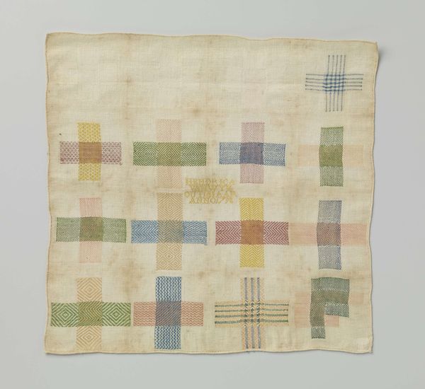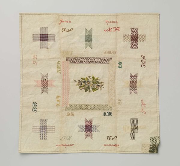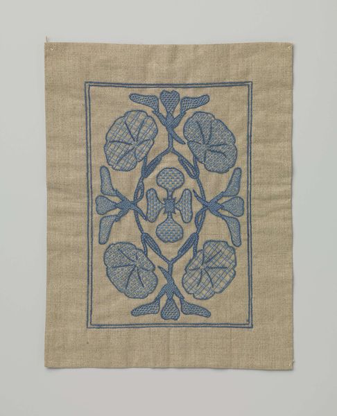 Editor: This textile piece, "Gebatikte sierdoek met arabesk," was created around 1910 by Willem Karel Rees. It's a beautiful drawing on fabric, showcasing an arabesque pattern. It’s rather calming to look at, with the circular design feeling very balanced. What strikes you when you see this piece? Curator: Ah, yes! It whispers secrets of Art Nouveau dreams. The overall geometry feels steady, doesn't it? Look at how Rees orchestrates floral forms, almost abstracted, but remaining ever so inviting to our imagination. Doesn’t it seem almost… hallucinatory, as if the very fabric sighs? How does that muted palette speak to you? Editor: It does evoke a dreamlike quality. The colors are soft, and create this sense of nostalgia, of something old. It's clearly a patterned textile, but there's something special beyond simple design. Curator: Exactly. Think about early 20th-century batik, which, with this piece, attempts to rise into ‘high art’. We are witnessing something of a quiet manifesto. Doesn't that whisper to your rebellious undergrad spirit? Editor: I love that! So, it's not *just* a pretty piece of fabric. It's pushing boundaries, blurring art and craft…almost a challenge to the traditional art world? Curator: A silent but stylish dare, you see! A question mark etched onto cloth. Editor: It's changed how I look at this. I initially saw it as decorative, but now I recognize something far more potent. It seems so delicate, and yet so bold. Curator: The tension between seemingly opposing forces makes art really come alive for me. Like a sweet fruit with a delightfully sour center, no?