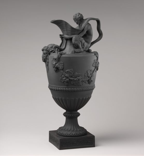 Editor: This intriguing vase, "Vase with Cover," was created between 1769 and 1780 by Wedgwood and Bentley. Crafted from ceramic, it’s currently housed at the Metropolitan Museum of Art. I'm immediately struck by the overall somber tone and the dramatic presence of those lion head handles. What can you tell me about it? Curator: This piece embodies the Neoclassical movement’s fascination with antiquity, and more specifically the use of this aesthetic by those with an active abolitionist cause. Consider that Wedgwood was deeply involved in the abolitionist movement, producing items bearing the slogan "Am I Not a Man and a Brother?" Do you see echoes of ancient forms, particularly Greek and Roman vases? Editor: Definitely. It looks like something straight out of a museum of antiquities. So the vase style was popular at the time? Curator: Absolutely. It's essential to remember that Neoclassicism was more than just an aesthetic preference. It also served as a means to promote ideals like reason, order, and civic virtue, ideas that resonated strongly during the Enlightenment. But notice how this isn’t a celebratory, colorful scene as you would see during the Renaissance, but something of a far darker political message. Editor: So the serious tone I noticed wasn't just my imagination; it's a deliberate part of the statement! That's fascinating. How does knowing Wedgwood was a passionate abolitionist affect how we view this work? Curator: Well, considering that art can be viewed in dialogue with socio-political issues, can you see the political relevance and messaging through design for reform and greater equality of opportunity, beyond just taste or status? How would an abolitionist use imagery at this time? Editor: This piece is more than just a vase, but a piece with symbolic potency about pressing political ideas. I see the artist using something from history to discuss issues very present at the time. Curator: Exactly.