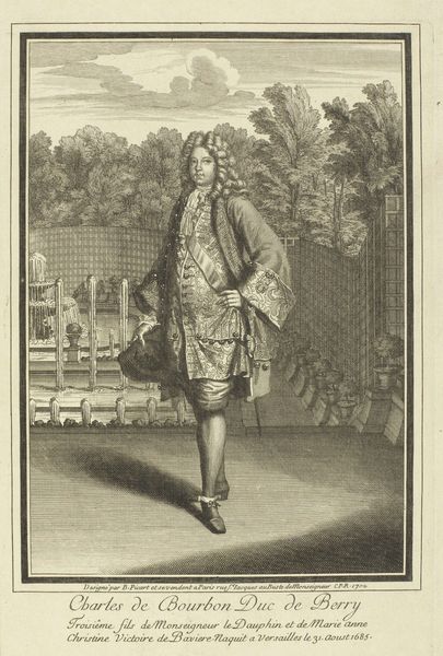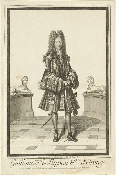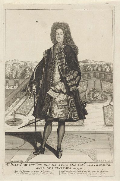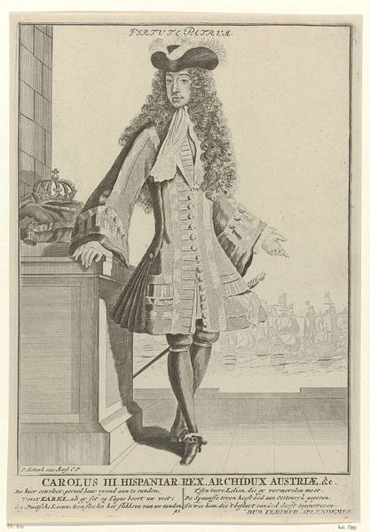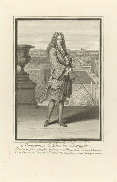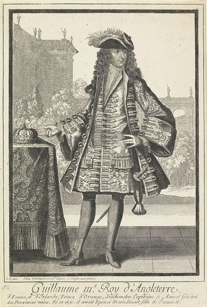 Editor: Here we have a piece titled "Portret van John Churchill Marlborough," likely from sometime between 1645 and 1722, attributed to Justus Danckerts. It's an engraving, so a print. There's almost a swagger to the figure, so self-assured, although that could just be the wig and frilly collar talking! What leaps out at you? Curator: Ah, yes, John Churchill, the 1st Duke of Marlborough. That wig practically screams Baroque! To me, this isn't just a portrait, it's a carefully constructed piece of propaganda. Look how he's posed, just so, and see the battle raging in the background? It's all designed to project an image of power and victory, don’t you think? Almost as if he casually dropped in after winning the day and his coiffure has barely moved. Editor: I hadn't thought about it that way – more as a display of wealth. The details of his clothing and the rather elaborate drapery certainly suggest a privileged background. I wonder though, how much of this is fact and how much is designed to convey power, as you suggest? Curator: Exactly! Think about the context. This was a time of intense political maneuvering. Images like these were vital in shaping public opinion and legitimizing power. Consider how carefully crafted even the simplest of engravings were, meticulously planned, revised, approved. How different to the throw-away imagery we’re saturated with now! Ask yourself, what's real, and what’s simply curated? Editor: That makes me look at it very differently. The slightly chaotic battle scene almost feels stage-managed. And perhaps the hat lying discarded on the table as a signal that the day is done. Thanks. Curator: And I appreciate the reminder of how striking that wig must have been, what it represented! A good day of art appreciation, all around.