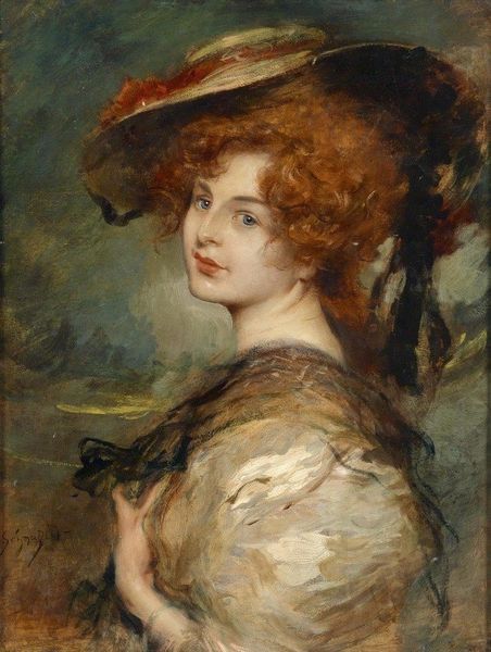 Curator: Here we have Renoir's "Woman in a Flowered Hat." Immediately, I’m drawn to its luminous quality. The painting just exudes a sense of soft, diffused light. Editor: Yes, the dappled effect is classic Impressionism. Renoir, of course, was deeply involved with depicting modern life and the leisure activities of the bourgeoisie. We see it repeated over and over again, this sort of "snapshots" of everyday beauty in social settings. Curator: Certainly, the work is representational in subject, but look closely. It's less about photographic accuracy and more about capturing an atmosphere. Note how forms dissolve into light and shadow. The brushstrokes themselves are quite visible. They function as marks of color that build up the form rather than imitate. Editor: What strikes me is this fashionable hat. The visual emphasis underscores the commodification of identity – how trends shape and reflect social status in late 19th-century Paris. Also notice how pale she appears to be. Her attire gives off a strong romantic and feminine ideal, however the image may serve the male gaze. Curator: Possibly. However, Renoir’s style here is almost exclusively concerned with opticality, with recording how light plays across surfaces and textures. We can see the brushwork creates this optical brilliance, reflecting and refracting through his masterful command over plein-air oil painting methods. Editor: That technique, you’ll agree, isn’t neutral. The embrace of fleeting moments can easily deflect attention from some grimmer socio-economic realities. Renoir presents the world of women like this as innocent, apolitical beings... I find it to be almost infantilizing when viewing from a modern lens. Curator: I’m not certain that Renoir set out with that deliberate purpose in mind, even so, one could interpret the work through such framework, viewing the work beyond his original intentions. His genius lay in the manipulation of color, in creating visually dazzling effects and how that can reflect different messages when society itself experiences profound change. Editor: Precisely. Looking beyond Renoir's individual "genius," it reminds us art and aesthetics exist in a wider society with particular ideas and ideologies.