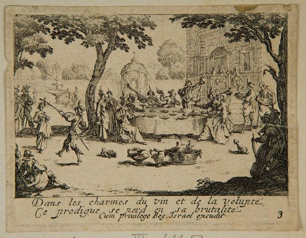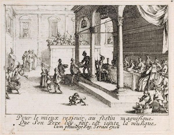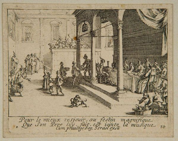 Editor: This is Jacques Callot’s etching, "Receiving His Heritage." There's so much activity packed into this small space; it almost feels chaotic. What do you make of it? Curator: Chaotic, yes, but a deliberately orchestrated chaos! Callot, bless his heart, uses incredibly fine lines to create depth and detail. Imagine each scratch of his burin, each tiny mark telling a story. It’s like a stage, isn’t it? Look at the dog! He's practically directing the scene. Editor: A stage... that's an interesting way to see it! I was so caught up in the details, I missed the bigger picture. Curator: Well, isn't that what art's all about? Missing, finding, and missing again. Editor: Definitely food for thought. Thanks!