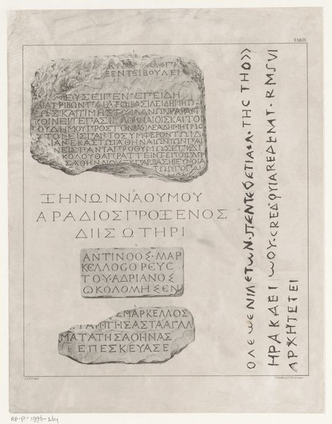 Editor: So, this is "Proscinemi, Olympia" by Joe Tilson. I’m immediately struck by the earthy tones and the almost archaeological feel. It’s like a fragment of something ancient, a memory perhaps? What do you make of it? Curator: A memory, yes. Faded, perhaps? It feels like a layered narrative, doesn't it? The ancient script, the worn sandals... Tilson often blends classical and contemporary elements. Are the sandals resting or just passing through, do you think? The juxtaposition of permanence and transience is quite moving to me. Editor: That's a great point about the sandals. I hadn't considered that tension. So, it's a story about time then? Curator: Time, place, and perhaps the very human act of leaving one's mark, however fleetingly. It’s a quiet piece, yet so resonant. Editor: I can see that. It's much deeper than I initially thought. Thanks for pointing that out!