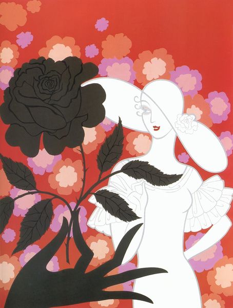 Editor: Here we have "Columbine" by Erté. This portrait possesses a certain elegance, even in its sorrow. What's your reading of this stylized depiction? Curator: Ah, Erté. His work is such a lavish dance between fantasy and reality. The piece feels like a whisper from the Art Deco era. Look how the figure, draped in stylized flora, almost melts into the black void. To me, it speaks of fleeting beauty, a melancholic waltz with impermanence. What do you feel from that bold use of black, that vast nothingness? Editor: It feels quite theatrical, doesn’t it? As though she’s alone on a vast stage, bathed in a single spotlight. Curator: Exactly! Think of Erté's background in costume and set design. The black amplifies the drama, turning the figure into a spectacle of fragile beauty. I wonder, does her downcast gaze evoke a sense of personal longing? Or perhaps it is more symbolic of the era's disillusionment after the First World War? Editor: I think it's interesting how the petals frame her, yet also appear to fall, almost as tears. I hadn’t really considered the historical context. Curator: That's the joy of Erté; it invites you into its dazzling and subtly somber world, layer by layer. Every line, every petal, holds a story. A beautiful visual poem. Editor: I see it! Thanks for that insight into the visual poem.