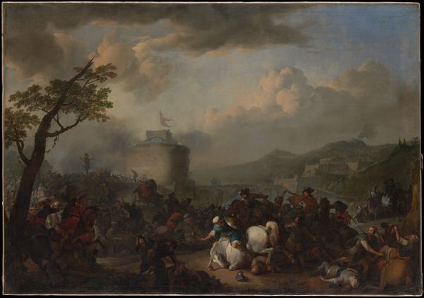 Curator: Before us hangs Philips Wouwerman’s "A Horse Fair near an Army Camp," an oil on canvas from approximately 1665 to 1668. Editor: There’s a remarkable looseness to the brushwork; look how the artist captures a sense of swirling activity within a very muted palette. It evokes a certain anxiety, a precariousness despite its genre-scene subject matter. Curator: Precisely. The painting's composition is structured around diagonal lines, drawing the eye from the foreground bustle toward a somewhat indistinct horizon. Note the use of impasto in rendering the white horse near the center; Wouwerman creates texture to emphasize the animal’s vitality. The dynamism is really created through materiality. Editor: And yet, despite all that activity, the figures and animals all seem caught within a historical moment steeped in uncertainty. Horses, of course, are classic symbols of war, virility, and even death, prominent across countless cultures from antiquity onwards. Curator: Indeed. The symbolic language around horses has clear semiotic presence. However, within the painting's construction itself, Wouwerman positions these symbols amidst tents and soldiers, rendering a temporary setting of military transit rather than outright battle or victory. The structure therefore underscores ambivalence. Editor: These horse fairs, then, take on the weight of transience. The animal changes hands as empires rise and fall. Notice how Wouwerman renders the distant tents; are those flags tattered, or simply blowing in the wind? The lack of clarity amplifies a visual language of ambiguity. Curator: Yes, his formal choices lead the eye to infer that sense of temporal displacement. Editor: So, in viewing a simple genre scene, Wouwerman’s construction of the painting prompts our thoughts toward war, displacement, the ephemeral nature of human existence, all mirrored by the movement and changing ownership of horses themselves. Curator: Quite so. Wouwerman presents us with far more than a mere snapshot of Dutch Golden Age life; he invites us to contemplate its subtle yet potent structural fragility. Editor: Ultimately, I’m left pondering how seemingly commonplace scenes gain profound power through art, revealing underlying anxieties and universal experiences.