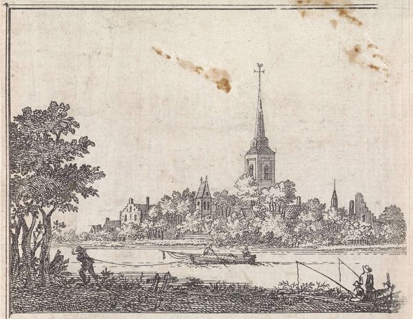 Abraham Zeeman created this print called 'Gezicht op Emmerik,' or 'View of Emmerik,' most likely in the first half of the 18th century, using etching techniques. Zeeman, born in Amsterdam, was the son of a marine painter, and he continued in his father's artistic footsteps. During Zeeman’s lifetime, the Dutch Republic was a major maritime power, deeply involved in global trade and colonial activities. This context is crucial for understanding his choice of subject matter. While this particular print depicts a cityscape, it’s important to note how the river becomes a site of commerce and connection. Zeeman’s identity as a Dutch artist is intertwined with the economic and cultural power of the Netherlands at the time. His landscapes are not simply neutral depictions; they reflect a nation’s self-image and its relationship to the world. By focusing on both the land and water, Zeeman captures the essence of a society that thrived on its connection to the sea.