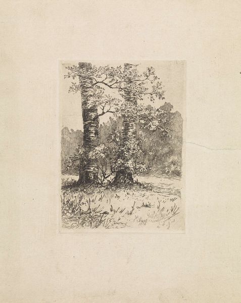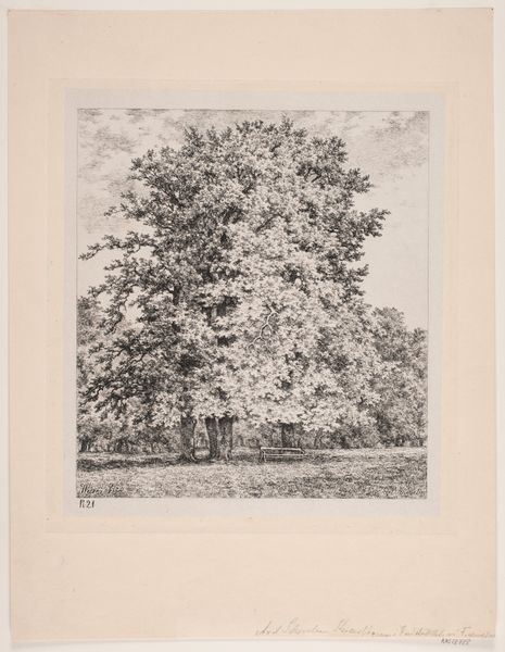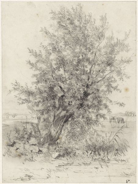Curator: Immediately, it reminds me of being happily lost, a wanderer deep in a secluded forest. The massed trees give such an inviting impression! Editor: Indeed. What we have before us is "Group of Trees", a drawing rendered in ink by Franz Kobell, and currently residing here at the Städel Museum. Its landscape composition certainly pulls one into nature, but let’s analyze how. The overlapping layers and intricate linework capture the density of the forest, a textbook example of Romantic-era sensibilities. Curator: Yes, exactly! Romantic with a capital ‘R’ for Raw and Real, perhaps. You can almost hear the rustling leaves and feel the dappled sunlight. And did they actually etch this? Remarkable control! I feel it as immediate expression rather than measured exercise in line. Editor: That perception hinges on your focus on emotion. Yet observe closely how Kobell manipulates light and shadow. The lighter ink work implies sunlight filtering through the leaves. The darker shades anchor the composition, providing depth and structure to an otherwise potentially chaotic mass. It creates spatial recession through value, rather like stagecraft. Curator: Hmm. Point taken. It is carefully crafted, this sense of wilderness. But doesn't that tension make it even more compelling? It's both wild and tamed, much like our own responses to nature itself, right? Editor: A valid connection. One can say Kobell acknowledges, in this very balanced composition, the ongoing dialogue between subjective feeling and objective analysis of the world. Curator: Exactly! Nature interpreted! Well, however the image finally strikes, it will offer the viewer many fruitful paths for aesthetic travel and inner response! Editor: Agreed. The beauty here resides as much in what is represented as in how we interpret it.