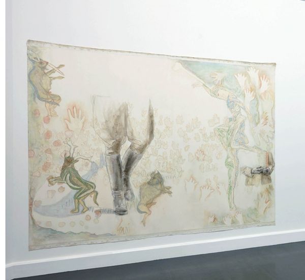 Editor: We're looking at Giuseppe Pinot-Gallizio's "Industrial Painting" from 1958, made with mixed media. The installation really fills the space! There’s something almost ritualistic about the way it unfurls. What's your take? Curator: Ritualistic, yes! It feels like an unravelling, a shedding of skin. I see this piece as less about industry, ironically, and more about the performative aspect of creation. Pinot-Gallizio talked about “industrial painting" as a way to mass-produce art, make it more accessible...but here, presented like this, it feels so intensely personal, doesn't it? Almost a rebellion against the very idea it’s meant to represent. Editor: So, the title is sort of... a provocation? Curator: Absolutely. Think of it as a conceptual wink. He's using the language of mass production to create something undeniably unique and… fleeting. It’s there in front of you, and it’s so present... then what? Does it get rolled away, tucked away only to be revealed to very few others? And notice the palette. It hints at landscape – earth tones, skies – but everything is blurred, almost like memories fading. Editor: That's a great point about the landscape. I was so caught up in the industrial part, I didn't fully appreciate that tension. So, what lingers with you after viewing it? Curator: The question, “What does it mean to produce art?" Does repeating an action over and over negate intention? For me it is a visceral response to a world accelerating and spinning seemingly out of control. What about you? Editor: Definitely rethinking my initial reaction! The planned obsolescence of art... kind of sad, but also weirdly empowering.