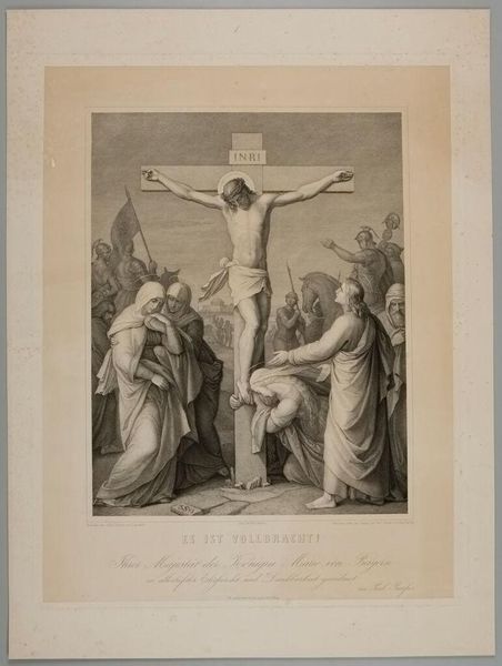 Curator: Ah, yes, looking at Joseph Leudner’s "Crucifixion," I'm immediately struck by the sheer weight of grief. It's as if the air itself is heavy with sorrow. Editor: What interests me is how the printmaking process, likely etching or engraving, allows for this incredible detail while also suggesting mass production and accessibility. Religious art for the people? Curator: Indeed! The fine lines almost feel like whispered prayers. To me, it's less about mass production and more about capturing a profound moment of spiritual reckoning. Leudner, who died so young, really poured his soul into this. Editor: But isn't that "spiritual reckoning" also a product of very material conditions? The church’s influence, the demand for such images, the availability of printmaking materials – all of it shaped the piece. Curator: Perhaps. I see it more as a testament to the human capacity for empathy. The composition guides you, drawing your eye to the suffering figure, but also to the mourners at the base of the cross, each lost in their private anguish. Editor: And let’s not forget the craftsmanship itself, the labor involved in meticulously creating this matrix. Each line is a testament to the artist’s skill, a physical manifestation of devotion. Curator: Well, whatever the origin, it undeniably leaves a lasting imprint, even centuries later. Editor: Absolutely, it’s a potent reminder of how interconnected the sacred and the secular truly are.