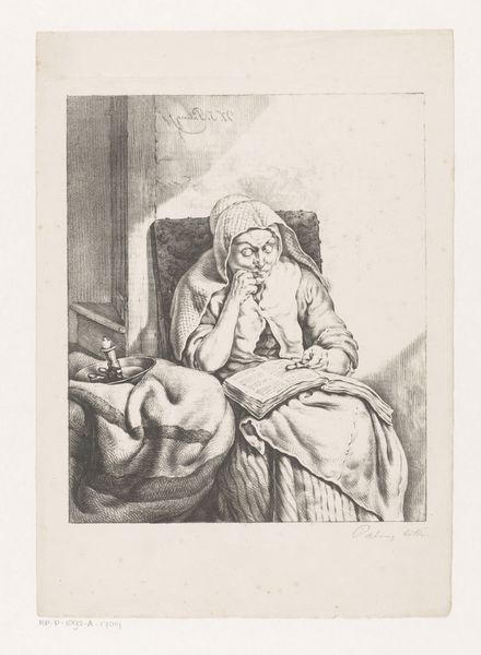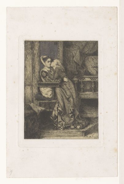 Curator: What a poignant piece. This is Jacob Spoel's "Mother and Child in an Interior," a watercolour from 1849 currently held at the Rijksmuseum. Editor: Immediately, I feel a sense of warmth and domesticity, yet there's a touch of melancholy, perhaps due to the muted color palette. Curator: The use of watercolour lends itself to that intimate atmosphere, doesn't it? Notice the spinning wheel, the clock—symbols of domestic labour and the passage of time, which contribute to our understanding of gender roles of that era. Editor: Indeed. We're seeing the romanticised view of motherhood through the lens of the mid-19th century. The image echoes the idealisation of the maternal figure prevalent in Western society at that time. Curator: The composition guides our gaze from the mother's face to the child, then outward toward the setting. There's also that interesting contrast between the working life suggested by the spinning wheel and the nurturing love represented by mother and child. It emphasizes the private sphere, doesn't it? Editor: Exactly, Jacob Spoel situates mother and child outside the frame of institutional settings. Motherhood, especially, was very much contained in the private, domestic sphere. Is this meant to be seen as idyllic? Or limiting? Curator: It's open to interpretation, of course. Perhaps a reflection of contemporary societal expectations placed upon women in 19th century Holland? I find the light in the image significant. It highlights the tenderness and closeness between the two figures, even though everything about their physical surroundings feels so dour. Editor: Looking at the symbols like you pointed out -- the spinning wheel, the clock--they create this cultural picture of the domestic role expected of women during the Romantic period. Curator: This image clearly shows how family imagery reflects historical views on gender roles and sentimental feelings. It encourages reflection on their social position in the 19th century. Editor: A wonderful synthesis of intimate family imagery and revealing cultural memory from a distinct point in Dutch social history.