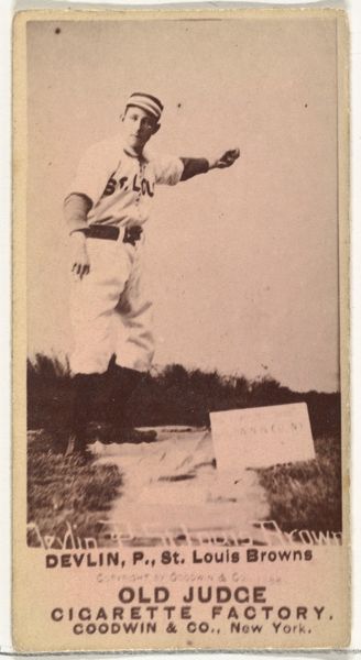 This late 19th-century baseball card, made by Goodwin & Company, features Brooklyn's first baseman, Phillips, and was a promotional item for Old Judge Cigarettes. The card is a mass-produced object, printed on thin paper stock, reflecting the rise of consumer culture and advertising at the time. The photographic image on the card highlights a moment of action on the baseball field. Although this seems far removed from craft, we can see the hand involved in the construction of the image. To make the photo more distinct, it has been carefully worked over, especially around the player. The creation of these cards was labor-intensive, involving photography, printing, and distribution—a testament to the industrial processes that fueled the era's economy. It also underscores the connection between leisure activities, commercial enterprise, and the working class, who were both consumers of the product and potential subjects of the image. This card reminds us that even seemingly simple images carry complex stories about the world of labor, production, and consumption that surrounded their creation.