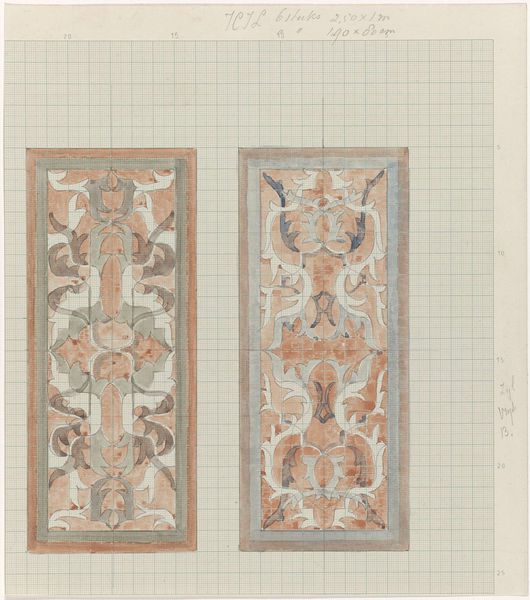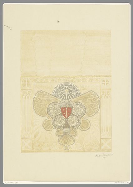 Carel Adolph Lion Cachet created this decorative ornament with watercolor and pencil. What strikes us first is the symmetry, the way the composition is anchored around a vertical axis. The muted palette of grays, yellows, and browns gives the artwork a somewhat reserved feel. Yet, the ornamental style suggests a confluence of design influences that reflect the aesthetic and cultural landscape of the early 20th century. The double-headed lions create a play of mirroring and doubling. The overall structure suggests a deeper commentary on themes of duality, mirroring, and symmetry, perhaps reflecting the artist's interest in the symbolist movement. Note how the artist destabilizes any fixed or singular interpretation. The ornament serves as an intellectual game, challenging the viewer to decode the underlying principles that govern its creation. The rigid lines of the grid offer a structure, highlighting the work's artificial construction. It's a visual puzzle, where form and meaning are intertwined.