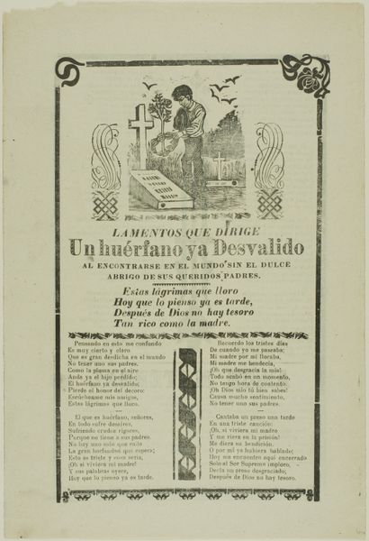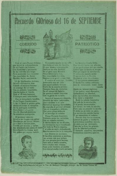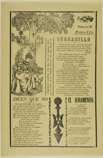 Curator: Let's take a moment to observe this fascinating print entitled "Con las suegras, poco y bueno," or "With the Mother-in-Laws, Little and Good." It’s by Manuel Manilla, and while it doesn’t have a specific date, we believe it originates from the late 19th century in Mexico. The print combines etching with typography on paper and resides in the Art Institute of Chicago's collection. Editor: It has such a strong graphic impact! The overall design, the busy layout—it evokes a sense of both folklore and social satire. There’s a stark duality between the written text and the roughhewn visual narrative above. Curator: Exactly! Manilla was known for his use of "hojas volantes," or broadsides, like this one, which circulated popular stories and social commentaries to a wide audience. The visual component of this example reflects strong currents of Mexican Muralism. It acted as a visual language accessible to everyone, despite their literacy level. Editor: Yes, I’m particularly drawn to the image at the top: it's seemingly a vignette depicting domestic strife—a daughter shielding her husband from a mother figure, while on the other side onlookers gesture and seemingly egg-on some physical altercations with bystanders nearby. There’s an underlying dark humor and clear suggestion of difficult familial relationships that persist across cultures. The symbolic weight of mother-in-law relationships is certainly palpable here! Curator: Absolutely. Manilla was really commenting on those everyday struggles but he was not beyond caricature. Notice also that above and below are rhyming verses, essentially acting like captions. In doing so he reinforced the didactic point for audiences, who perhaps chuckled and pondered the complex relationships illustrated here. It's about social norms and tensions within families—the universality of which probably contributed to the artwork’s broad appeal. Editor: It's quite brilliant how he manages to pack in a whole world of cultural symbolism and social commentary into one sheet of paper. One has to imagine just how many copies were made, distributed, and tacked up around the community—visuals and rhymes sticking with people long afterwards. Curator: It really encapsulates how art can serve a vital function outside the museum, acting as both entertainment and social commentary, a true mirror to society. Editor: A small page holding centuries of shared cultural understanding. Remarkable.