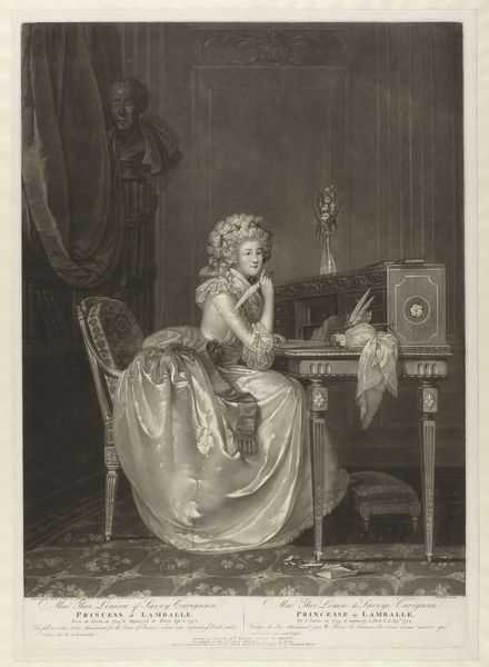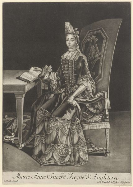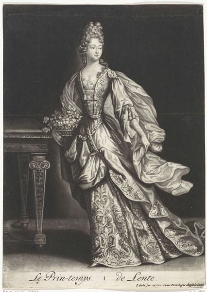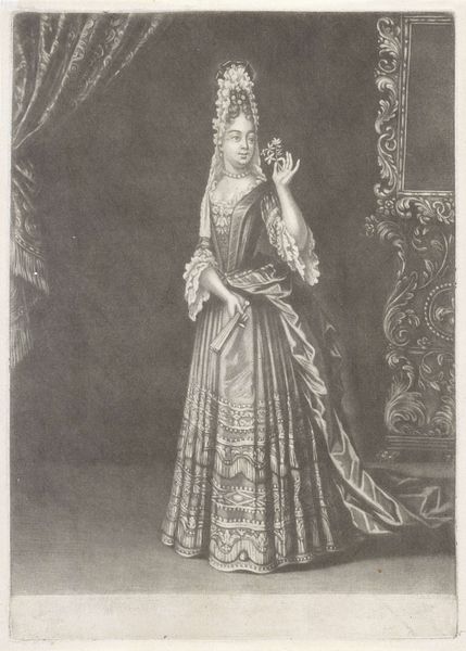 Pieter Schenk created this mezzotint titled "Reuk: vrouw naast een dampende pot," or "Smell: woman next to a steaming pot," around the turn of the 18th century. During this period, the Dutch Republic was a major center for trade and wealth. The image of a woman tending to a steaming pot might appear domestic, yet it also speaks to the global exchange of spices and aromatics which defined Dutch commerce. The woman, adorned in an elaborate gown, is positioned in a way that suggests both luxury and labor. Is she a merchant’s wife, engaging with the tools of trade, or is she a servant, attending to the olfactory desires of the wealthy? The scent rising from the pot becomes a symbol of both privilege and the complex dynamics of gender, class, and colonial trade.
