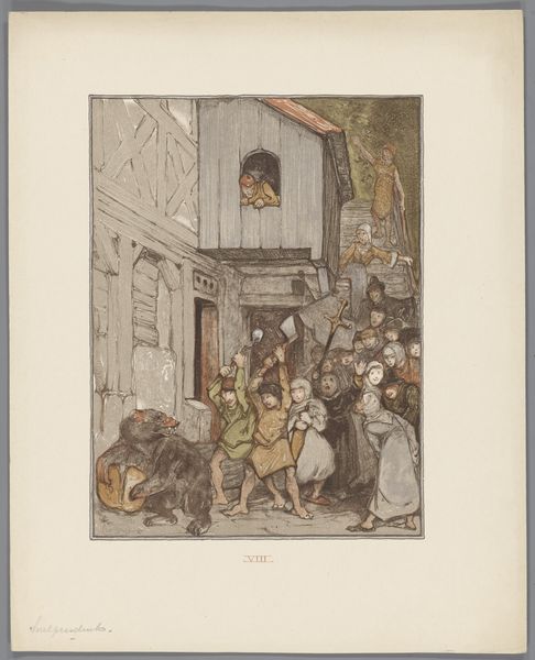 Henri Merke created this print, "Cries of London, No. 4: Do You Want Any Brickdust?" around the turn of the 19th century. The composition is immediately striking, divided into distinct planes that draw us into London street life. The foreground bustles with activity, focusing on the exchange between the brickdust seller and a woman, while a donkey stands laden with sacks. Merke uses a variety of colors and textures to delineate each character and their relationship to each other. The lines of the buildings in the background converge, creating a sense of depth. The gazes of the figures, including the dog, add a psychological element, enhancing the narrative. Structurally, the artwork can be understood through semiotics. The brickdust seller is represented by a series of signs, each telling us something about his social position. The print engages with ideas of social hierarchy and the representation of marginalized figures. These visual elements and cultural codes reflect the context in which Merke was working.
