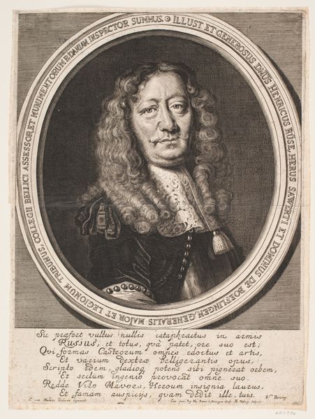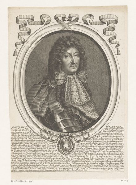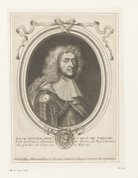 This is Nicolas de Larmessin's print of Godefroi, Comte d'Estrades. Notice the oval frame, a self-contained world rendered with precise, controlled lines. Larmessin uses line and form to create a rigid structure around the Comte, yet infuses elements of softness with the draped ribbon at the top and the flowing hair. The contrasting textures of the Comte’s armour and lace cravat destabilize the reading of his social persona. Consider how Larmessin employs semiotic codes of portraiture. The gaze is directed, yet distant; the armour signifies military prowess, but the lace hints at aristocratic refinement. These elements create tension within the portrait's structure, and ask us to question the signs of power and identity. The print invites us to reconsider the fixed meanings that we attach to the symbols of status and character. It prompts us to reflect on how such symbols are not just aesthetic choices but also constructs of cultural and philosophical discourse.