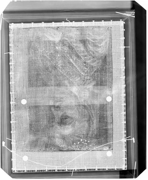 Editor: Here we have a 14x17 inch X-radiograph of "Legend of St. Nicholas," originally by Neri di Bicci. It’s kind of eerie seeing the bones of the painting. What can you see in this ghostly image? Curator: It’s like an archaeological dig, isn't it? Peering beneath the surface to glimpse the artist's process. I see the density of the paint, the underdrawing, perhaps even earlier versions of the composition. Isn't it amazing how technology lets us whisper secrets with the past? What do you make of the lighter patches? Editor: I think it’s where the paint is thinner, or maybe where different materials were used? It’s wild to think about what’s hidden under the surface of paintings we admire. Curator: Exactly! It’s a reminder that every artwork has its own secret history, just waiting to be unearthed. A beautiful accident, indeed.