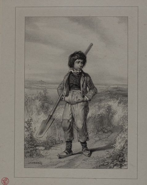 Cornelis Steffelaar created this etching, "Jonge boer," using a metal plate, likely copper or zinc, to produce fine lines and tonal variations. The printmaking process allows for the creation of multiple impressions, and speaks to a burgeoning market for affordable art in the 19th century. The image itself depicts a young farmer, identifiable by his wooden clogs and the basket he carries, suggesting daily labor. Steffelaar's skillful handling of the etching needle captures the weight of the boy's burden. The careful attention to detail in the woven basket, the texture of his clothing, and the landscape hint at the value of rural life and the dignity of labor. However, the seemingly endless reproduction and consumption of such images is tied to wider social issues of labor, politics, and consumption. By focusing on the materiality and social context of this print, we can better understand the full meaning of Steffelaar's work, challenging distinctions between fine art and craft.