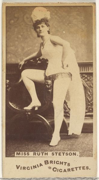 Editor: Here we have a print titled "Miss Eicle, from the Actors and Actresses series" by Allen & Ginter, dating from around 1885 to 1891. What strikes me is the tension between the formal portraiture and its origin as an advertisement on a cigarette card. It’s such a unique artifact, and the composition, with Miss Eicle perched somewhat awkwardly, creates an odd sense of…expectation, perhaps? What do you see in this piece, from a formalist perspective? Curator: Let's begin with the structure. Note how the artist utilizes a predominantly vertical orientation, dictated by the format of the cigarette card. The composition is divided into three distinct horizontal bands: the architectural backdrop suggesting a stage, the figure of Miss Eicle, and the textual information relating to the advertising. This stratification imposes a hierarchical reading. Furthermore, observe the limited palette. The subdued hues emphasize the line and form of the figure. The details are rendered with efficiency; minimal modelling is used to define the planes of the body. Editor: So you're focusing on how the artist uses lines and limited colours? Curator: Precisely. Consider the application of line to delineate Miss Eicle's costume versus its use in depicting the architectural details. The textures created and implied by these linear strategies perform a clear aesthetic function. What this image gains by its simplicity is particularly notable given the excess often employed by artists working during the period. Do you agree that we should read value in the restriction of palette and descriptive articulation of form? Editor: Yes, I see that now. The restrictions force you to concentrate on form, on what's really there. It makes this commercial art more engaging. Curator: Precisely. A fascinating synthesis of commerce and compositional considerations, wouldn't you agree? Editor: Definitely! I've learned so much by observing this portrait from the formal elements in its making. Thanks!