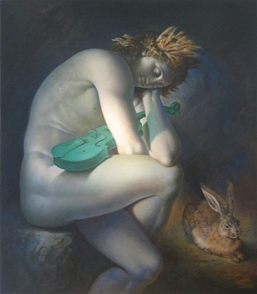 Dragan Ilić Di Vogo made this painting, called 'Hvala ti – Thank you' and I find the layers of meaning in this piece really engaging. It almost feels like the artist had to work through so many ideas before deciding that this was "finished." Look closely, and you'll see this isn't just a straightforward representation of Michelangelo’s David. It’s a David that is crumbling, literally falling apart in places! The way Di Vogo renders the cracks and fissures, it’s as if time itself is eroding this iconic figure. And then there's the splash of blue on David’s shoulder – a defacement, a mark of our times. But that splash also introduces a jolt of unexpected color within the work, a note of the artist’s hand within this otherwise classical scene. You can see a lot of art historical precedents here – Surrealism, maybe some Neo-Classical stuff – but ultimately it stands on its own two feet. It reminds us that art history is a conversation, and it’s one that’s always being rewritten.
