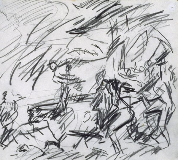 Curator: Looking at "Babits: The book of Jonah II" by Maria Bozoky, the immediate impression is one of chaotic movement. There's this visceral energy rendered through bold ink strokes. What stands out to you, Editor? Editor: I'm struck by how raw the materials appear. You see the gestural marks, the immediacy of the ink on the page. The labor is quite apparent. There's a roughness here that connects to the biblical narrative's themes of struggle and divine confrontation. Curator: Precisely. Considering Bozoky's choice to depict the story of Jonah, we can understand this piece as an engagement with themes of disobedience and repentance, which resonate deeply with human struggles against oppressive power structures and societal expectations. Editor: It's also a very stark depiction. There’s very little tonal variation; Bozoky relies almost entirely on line work to convey form and space. This directness in material translates, for me, to the direct confrontation Jonah has with his maker and his own destiny. The drawing process mirrors this kind of pressure. Curator: Right. It is compelling how this artwork embodies the tension between divine will and individual agency. The figure of Jonah is central, overwhelmed by the monstrous whale—a clear power dynamic. What does this starkness signal within the visual language of power relations? Editor: I would consider the lack of shading. The minimal treatment of Jonah emphasizes the figure as more of an outline or shell. Is it less about representing an individual than representing labor forced upon a reluctant subject? A form hollowed out, rather than a personality explored. Curator: That interpretation speaks volumes about human vulnerability when facing historical or political upheaval. One element that warrants careful attention is the overall lack of clarity. How does this obscurity surrounding the subject matter influence viewers? Editor: It feels unresolved and unstable, certainly. I find this ties into that sense of constant reformation we have been discussing – of labor constantly demanded to change our world – never solidifying into any singular thing, instead constantly evolving with the drawing. It presents more questions about process and intent. Curator: Looking at the image through these lenses enriches our appreciation for Bozoky’s nuanced approach, don’t you agree? It moves beyond simple representation into profound cultural commentary. Editor: I would add a vital component in viewing artwork as part of larger manufacturing questions. The artist here has certainly forced me to see materials and art-making anew within historical concepts of change.