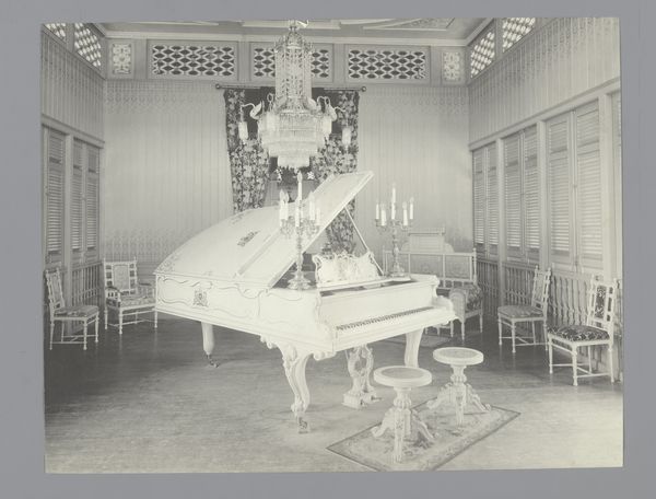 Curator: Let's discuss this photograph, a gelatin-silver print taken sometime between 1894 and 1895. It depicts a "Salon in het Gezirah Palace Hotel in Cairo" and comes to us via an anonymous photographer, revealing much about the Western gaze on the East at that time. Editor: Wow, immediately, I’m struck by the sheer density of detail! The photograph has this hazy, almost dreamlike quality to it. And there's something deeply unsettling about seeing this opulent, Western-influenced interior transplanted into Cairo. Curator: Precisely. We see evidence of Orientalism in the composition, with that very large sofa seemingly offering viewers the comforts of Europe superimposed onto an Egyptian backdrop, exoticized and consumed for European visitors. Editor: You can almost feel the weight of that chandelier! It’s all heavy ornamentation and formal posing, like everyone is consciously performing wealth and sophistication for the camera. I keep imagining ghosts flitting through. Curator: This performance speaks to the very real power dynamics inherent in colonialism, and how they were reflected through not just photographs, but through spatial arrangement and interior decoration. The salon becomes a stage upon which these dynamics unfold. Editor: Right! I’m also stuck on how eerily depopulated the image is, there's an alienating feel, it's staged like no one lives there... Curator: And we might discuss this in the context of labor—who served tea here? Who swept these floors and cared for these plants? Those people are notably absent from the frame, rendering this scene less about the space itself and more about a Western fantasy constructed and reinforced through their absence. Editor: That's right. It is ghostly and silent. As though it preserves and broadcasts privilege as emptiness and absence. You look closely and it is a fascinating photograph of Western hegemony, with an unsettling undercurrent... Curator: Absolutely. It’s a testament to the power of images not just to document but to shape and reinforce narratives, making visual arguments that still resonate with discussions around power, privilege, and representation today. Editor: Well said. Seeing it this way offers up more than simply a historic rendering. It becomes a stark commentary on the gaze and who has permission to even be included in the view. Food for thought!
