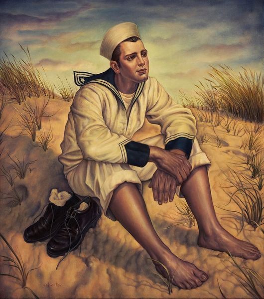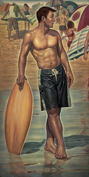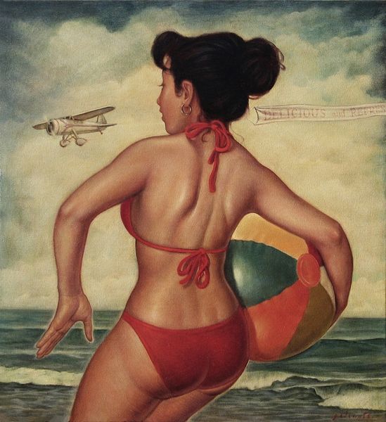 Danny Galieote’s painting presents a lifeguard in a moment of contemplation against the backdrop of an amusement park. Galieote’s idealized, hyper-masculine figure, evokes nostalgia for classic American archetypes while subtly challenging conventional representations. In the context of 20th-century visual culture, where gender roles were sharply defined, the artist uses a traditionally masculine subject, but imbues it with a certain vulnerability. The red flag waving above the lifeguard, and the bitten apple at the base of his seat, give this image a feeling of danger, and a hint of the forbidden. By using an idealized figure, Galieote plays with themes of desire and the male gaze. What does it mean to look, and be looked at? “Duty Calls” invites us to consider the complex interplay between duty, desire, and the male form.
