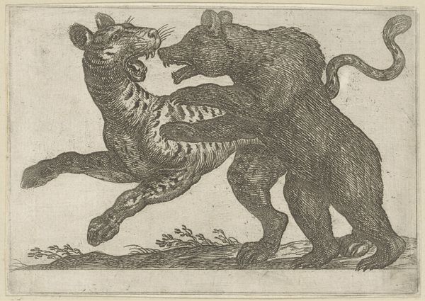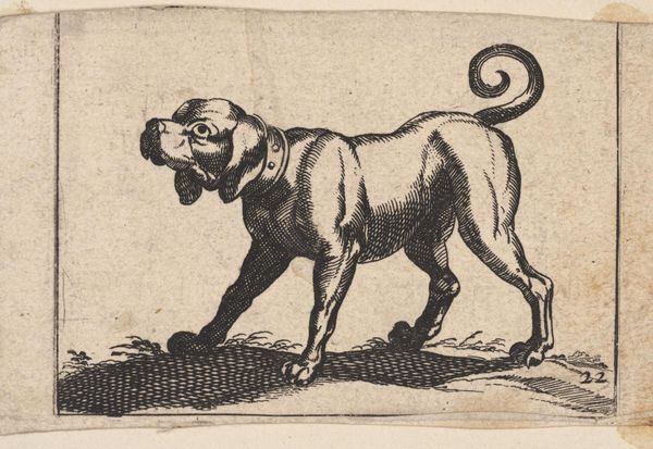 Editor: Here we have Antonio Tempesta's "Monkey with an Apple," a small etching. The cross-hatching gives the monkey a textured, almost furry quality. What can you tell us about it? Curator: Well, monkeys in art often served as symbols of base instincts or foolishness, a commentary on human nature. How does this image engage with power structures of the time? Editor: I suppose, given the apple, it could be an allusion to temptation or a commentary on appetite. Curator: Exactly. And considering Tempesta's audience, this work likely reflects societal attitudes toward nature and the "other," reinforcing hierarchies. Does knowing this change your perception? Editor: Definitely. It's a reminder that even seemingly simple images can carry loaded meanings. Curator: Indeed. Art is always in conversation with its context.