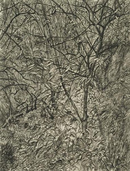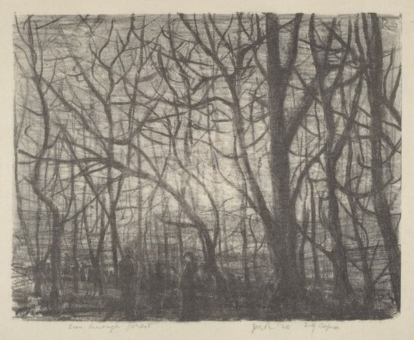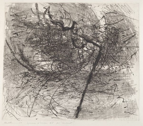 Editor: Here we have Ruth Cyril’s “La Foret Aubergine,” a print from 1962. It's a dense thicket of lines depicting a forest scene; it feels claustrophobic. What formal qualities stand out to you? Curator: The intricate web of lines immediately arrests the eye. Notice how Cyril utilizes line not just to delineate form, but also to create texture and spatial depth. Observe the density and variation in weight and direction; the line functions semiotically, translating natural phenomena onto a two-dimensional plane. What about the colour itself, what is that communicating? Editor: The monochromatic aubergine palette certainly contributes to the somber mood and unifies the composition, doesn't it? The lack of vibrant hues shifts the focus solely onto form and the relationships between the lines. I wonder why Cyril made it monochrome? Curator: Precisely. The limited palette forces us to concentrate on the structural relationships. Ask yourself, what happens when colour is intentionally withdrawn? Here it permits us to dissect how the network of crossing lines and layering generates a sense of depth and spatial ambiguity. Where do you imagine light is coming from, and what compositional strategies have been used to deliver this effect? Editor: I see more delicate lines in the background suggesting distant trees and creating layers of depth. It’s almost like a tangled etching; the dark tones against the lighter create this visual vibration across the image, doesn't it? Curator: The juxtaposition of these dense clusters and finer marks contributes to the overall dynamism. Cyril makes skillful use of positive and negative space, where the absence of line is as crucial as its presence. It is through observing these careful manipulations of these techniques that a semblance of the real comes through the abstract. What could the structure mean here? Editor: I’m beginning to appreciate how the absence of color, together with the density of the lines, creates a dynamic interpretation of this landscape. Thanks, it has made me notice those underlying dynamics, I wouldn't have considered before.