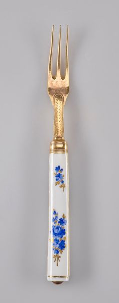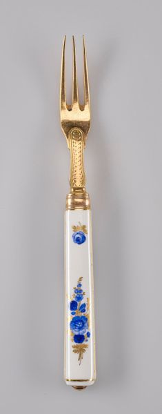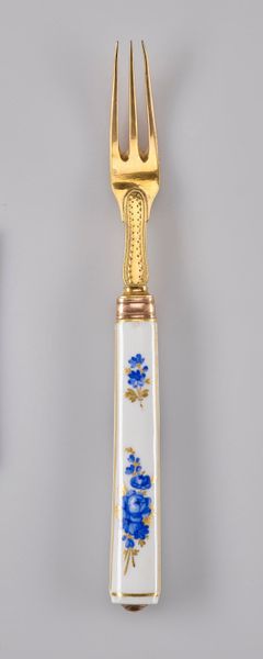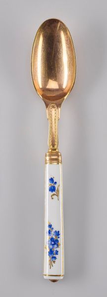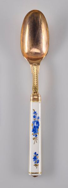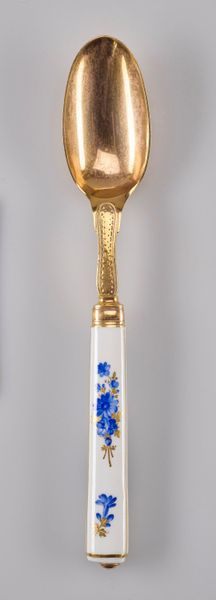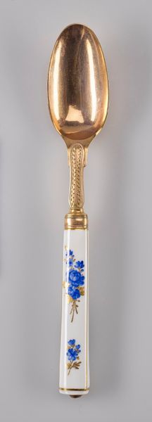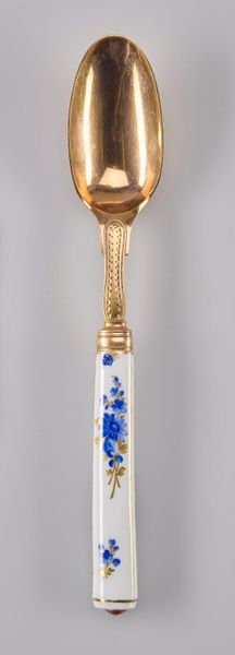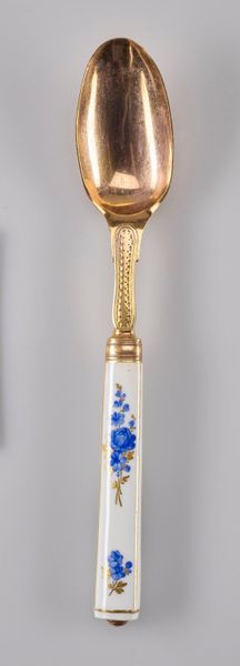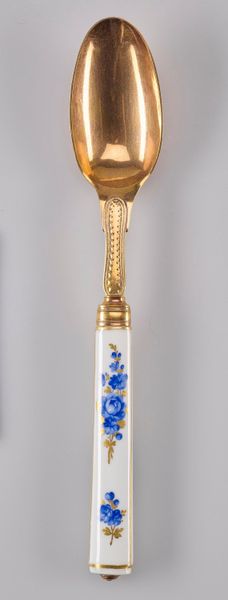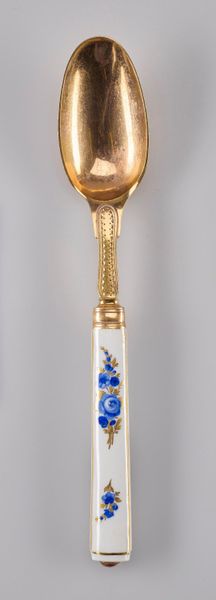 This spoon was crafted by the Meissen Porcelain Factory, established in 1710. It features a captivating blend of materials and textures that speak to the aesthetics of its time. The spoon's bowl, gleaming with a golden hue, contrasts sharply with the matte porcelain handle, which is adorned with delicate blue floral motifs. The composition of the spoon is carefully structured. The golden bowl transitions into an intricately patterned neck, guiding the eye smoothly towards the handle. The handle is framed with golden lines, which create a sense of enclosure around the floral decoration, emphasizing its beauty. The handle’s rectangular shape and the bowl’s curvature highlight the dialogue between geometric precision and organic fluidity. This interplay reflects broader concerns about nature and artifice, where the spoon becomes a cultural artifact embodying both functional design and artistic expression.