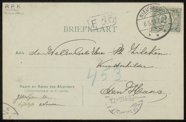Curator: Let's turn our attention to "Briefkaart aan Anna Dorothea Dirks" by Wally Moes, estimated to be from before 1913. It’s crafted with ink on paper. The artistry is particularly striking considering its everyday function. Editor: I find it rather melancholy, actually. The aged paper, the fading ink… it speaks of a time long past and a message perhaps unanswered, or at least, its impact unknown to us now. Curator: Indeed. And observe how Moes employs calligraphy here – a conscious invocation of tradition. Notice, also, the formal structure of a handwritten letter that blends seamlessly with personal expression through handwriting, almost as if the writing becomes image, like the later Pattern and Concrete poetry movements of the mid-20th century. Editor: Right, and that handcrafted element underscores the personal connection – the labour and the material investment in communication before mass production fully took hold. The stamps, the postmarks...these physical markings speak to a whole system of delivery, the physical and human network involved. It gives value and highlights something usually dismissed. Curator: Precisely! Even the choice of script, with its elegant loops and flourishes, reveals a deeper layer of social ritual and decorum associated with letter writing of that period, like other postcards used as tools for education and even love-notes. Editor: The paper itself also must've been fairly common for postcards, which speaks volumes about material conditions of its time. Curator: Well, I appreciate how this little card reveals a world where the hand-written word held tremendous power, almost like a tangible extension of one's presence. It makes me think about the ephemerality of digital communication today. Editor: Absolutely. Considering the labor invested here transforms our understanding of its function – it is not merely a postcard, but a small monument of everyday life and craft from which much of what exists today depends. Curator: A lovely sentiment to close on, acknowledging how visual traces can allow past selves to make their mark. Editor: Yes, that these mundane fragments gain such cultural presence is a true delight.