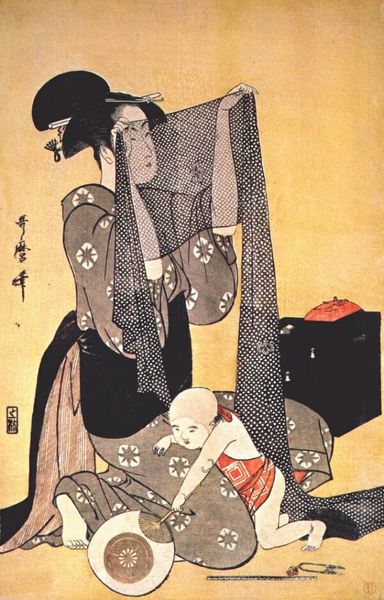 This woodblock print, likely created by Kitagawa Utamaro, depicts women engaged in dressmaking activities. Notice the flat planes and bold outlines which define the figures and objects, set against a muted backdrop. The composition is carefully arranged; the figures and objects are placed to create a sense of balance and visual harmony, evoking a scene of everyday life with subtle elegance. The use of patterns in the garments introduces complexity and visual interest. These patterns serve not only as decorative elements but also as signifiers of social status and aesthetic sensibilities. The scene invites us to consider the ways in which clothing functions as a form of visual communication. Ultimately, the print can be seen as a commentary on the intersection of aesthetics, labor, and social identity. It prompts us to reflect on the values and meanings we attach to both artistic representation and the material culture of everyday life.