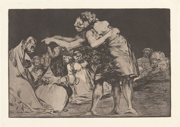 Curator: The moment my gaze fell upon this piece, it felt like walking into a fever dream—all shadows and stark expressions, utterly captivating! Editor: Indeed! What you are reacting to is "If Two to One, Stuff Your Arse with Straw," an etching by Francisco de Goya, likely created sometime between 1815 and 1823, and now residing here at the Art Institute of Chicago. Curator: "Stuff Your Arse with Straw"—that’s quite a provocative title, isn’t it? It really prepares you for the rawness within the image. Tell me more about why he chose this title for this work. Editor: Well, the "Proverbios," or "Proverbs," series is characterized by obscurity and ambiguity. What you see here are multiple figures, the clear oppressor holding up a weapon over his head ready to beat these huddled individuals that he deems beneath him. It's believed Goya was influenced by political oppression under the restored monarchy. Curator: Oppression—absolutely. The composition, with its figures clumped together, evokes an incredible sense of claustrophobia, doesn't it? As though they're physically weighed down by dread. Editor: The dense composition and the limited tonal range definitely heighten that effect, reinforcing a sense of societal burden and inequity. Look at how some faces appear vacant while others are full of rage. Curator: Right! I'm also struck by the dynamism Goya manages to create with etching, particularly in the man with the sword. He feels both imposing and unhinged. A symbol of power teetering on the edge of madness, perhaps? Editor: I think that’s a perceptive observation. It speaks to the psychological tension Goya so powerfully captured throughout his career. And this psychological element ties into the broader Romantic movement, with its exploration of intense emotions and the sublime. Curator: Knowing all that now—it still has this deeply unsettling, dare I say, contemporary resonance about it, doesn’t it? Goya peered right into our own age, somehow! Editor: I concur. "If Two to One…" resonates even today, compelling us to interrogate entrenched power structures and societal biases. Curator: Well, what a whirlwind. A punch to the gut of a proverb turned art—that's Goya for you. Editor: Indeed, a hauntingly powerful and perennially relevant glimpse into the human condition.